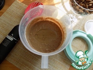 Наливаем масло подсолнечное. Я ещё добавлю для усиления запаха и вкуса миндаля концентрат миндаля, как указано на упаковке. Если такового нет, то не обязательно класть. Опять всё тщательно соединяем-подвзбиваем.