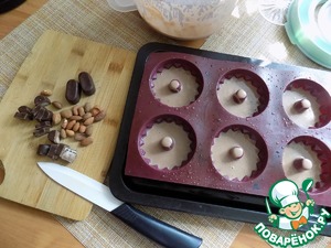 Берём формы для кексов. У меня вот такая силиконовая форма. Кексы получаются побольше обычных и количества теста как раз у меня на эту форму. У вас их количество может получиться больше! Орехи я беру обжаренный миндаль. Конфеты молочно-шоколадные режу небольшими кусочками. Силиконовую форму всегда обливаю водой. Разливаем тесто по формочкам на половину высоты.