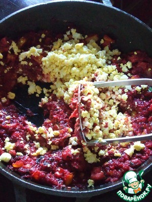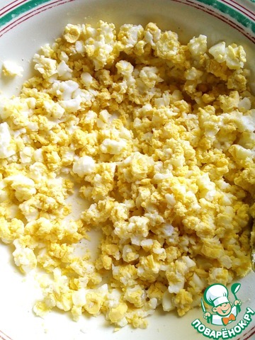 • Добавила яйца и все вместе ещё раз потолкла до однородности толкушкой для картофельного пюре.