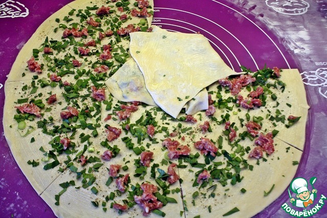 Теперь берём тарелку диаметром 22 см, кладём по центру дном в верх, от тарелки к краям круга прорезаем ножом для пиццы (для масла и тд) восемь лучей в виде трапеции. Заворачиваем каждую трапецию к центру, смазывая маслом