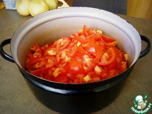Добавляем лук и чеснок в кастрюлю с помидорами.