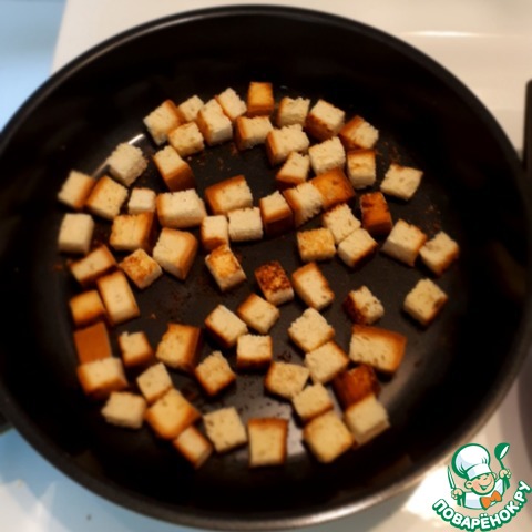Режем хлеб кубиками и поджариваем на сухой сковороде.