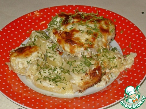 Я выложила бедра в форму для запекания на некотором расстоянии друг от друга. Промежутки заполнила ломтиками картофеля. -
