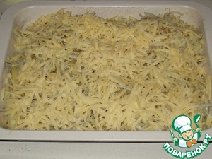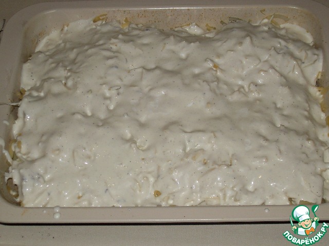 Сверху распределить лук, нарезанный тонкими полуколечками.
