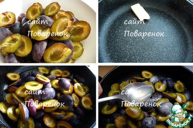 В сковороде разогреть сливочное масло, добавить сливы, сахар и сок лимона.
