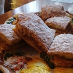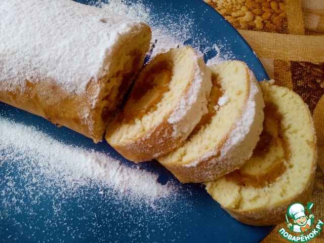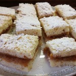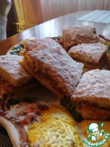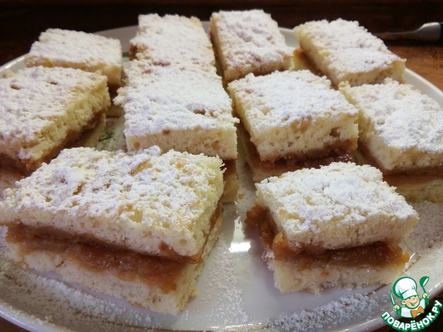Остывший пирог нарезаем квадратиками 5 на 5 см, и выкладываем на поднос один на один начинкой внутрь. Сверху посыпаем сахарной пудрой. Приятного аппетита!