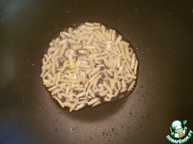 В воке или толстостенном сотейнике сильно разогреть масло. Быстро обжарить имбирь (постараться не спалить - иначе будет горечь). -