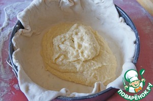 Срезать излишнее тесто по краям формы. Краешки завернуть на начинку. Выпекать при 180*С в течение 30-35 минут.