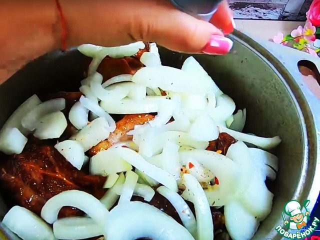 Выкладываем в этот же казан с маслом, картошку и сверху выкладываем наши ребра, после все это посыпаем нарезанным луком и заливаем 150 грамм воду. Посыпаем перцем (каждому по вкусу)