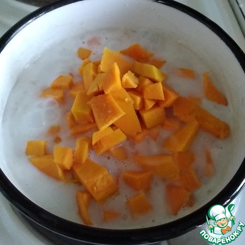 Параллельно с этим ставим вариться наш рис. Вы можете полностью сварить его на молоке (я очень люблю кашу на молоке!). Но, к примеру, у меня молока было очень мало, поэтому я до полуготовности варила рис на воде, затем влила остатки молока и варила до готовности. Примечательно, что в пост кашу можно просто сварить на воде. По вкусу добавьте соль и сахар, варите, помешивайте. Когда рис уже почти будет готов, хорошенько разбухнет, но у вас будет оставаться еще достаточно жидкости в кастрюльке, можем смело добавлять тыкву.