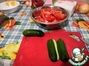 • Огурцы в этом блюде для хруста и объема. Режем помельче. Хватает 2 штук.