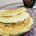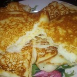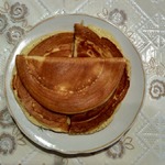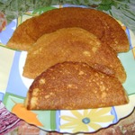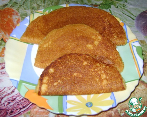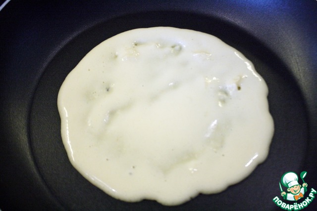 В разогретую сухую сковороду, выливаем на середину немного теста, примерно четвёртую часть, аккуратно размазываем, чтобы получился тонкий блинчик (здесь начались ругательства!!!).