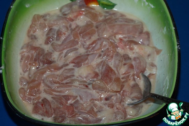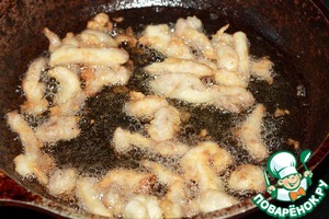 С куриных бедер снять шкуру и отделить мясо от костей. Как вариант купите готовое филе бедер. Можно делать и грудку, но бедро получается сочнее. Филе нарезать полосками. Добавить риовое вино (можно заменить хересом), соль, перец по вкусу, яичные белки, крахмал, посолить и поперчить по вкусу. Все перемешать и оставить на 30 минут.