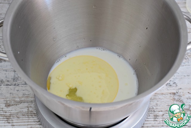 В теплое молоко влить кукурузное (подсолнечное, оливковое) масло, яичный белок (яйцо категории С0), всыпать сахар и перемешать. Сахар должен раствориться. |