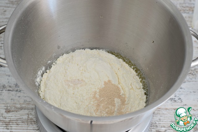 Муку просеять, смешать ее с солью и дрожжами. Всыпать муку к жидким ингредиентам и замесить тесто. |