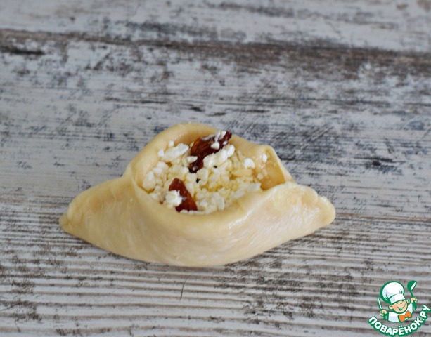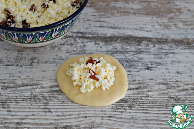 Тестовую заготовку раскатать в лепешку d 10-11 см, в середину выложить столовую ложку творожной начинки. |