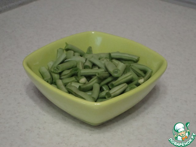 Зеленую фасоль вымыть и нарезать на кусочки длиной 3-4 см.