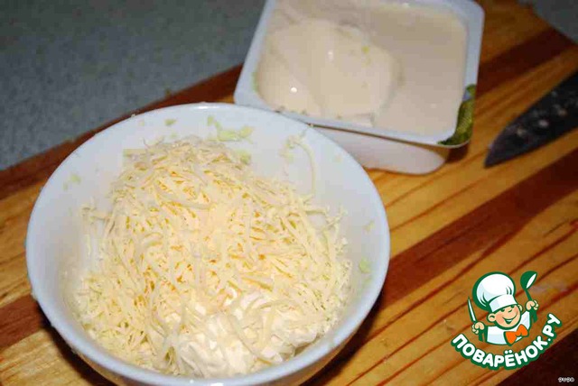 Добавляем выдавленный чеснок (без фанатизма) и 1 ст. л. майонеза.