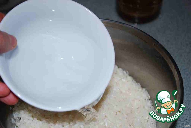 В кастрюльку, желательно с толстым дном, насыпаем рис (у меня расчет на японский манер - чашки типа пиалы), заливаем водой, нежно перемешиваем (лучше рукой) и воду сливаем. Так 2 раза.