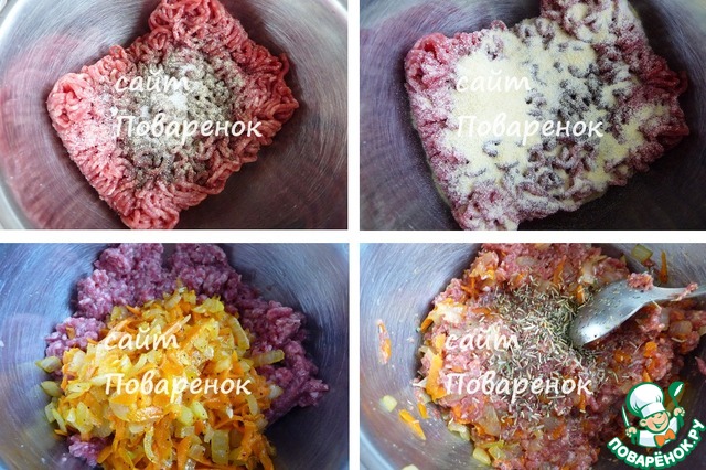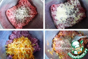 В фарш добавить соль (по вкусу), смесь перцев, манную крупу,