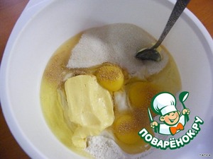 Смешайте муку с дрожжами. Добавьте 3 яйца, сахар, молоко, размягченное слив. масло и замесите тесто.