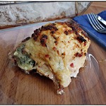 Наполнить этот карман смесью из сулугуни с кинзой, заколоть зубочисткой. Уложить куриные бедрышки в форму кожей вверх. Старайтесь расположить их так, чтобы край, заколотый зубочисткой, был приподнят и начинка не вытекала бы.