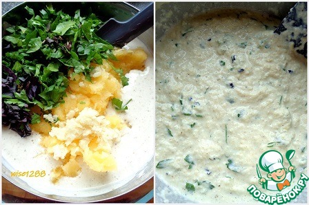 Затем добавить отжатые кабачки, петрушку, базилик, чеснок. Перемешать. Включить духовку разогреваться до 200 градусов.