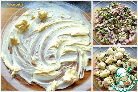 Форму для запекания смазать сливочным маслом. Колбасу и сладкий перец перемешать, выложить в форму. Сверху разложить цветную капусту.