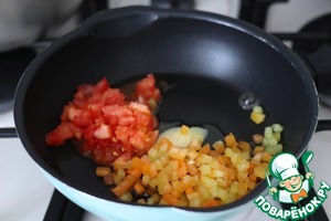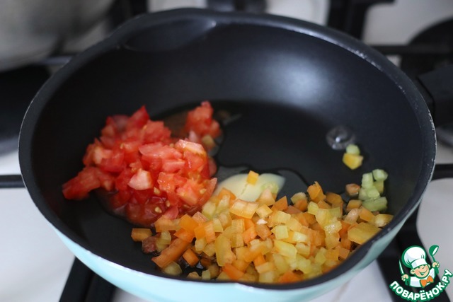 Болгарский перец нарезать мелкими кубиками. Помидор нарезать мелкими кубиками. На сковороду добавить 1 ст. ложку топленого сливочного масла. Пассеровать овощи на среднем огне до золотистой корочки и выпаривания лишней влаги.