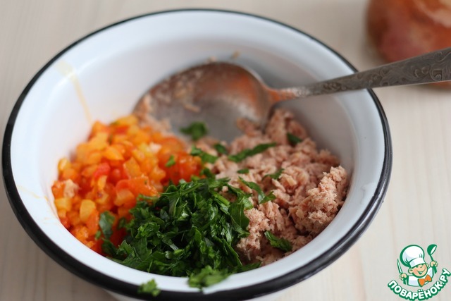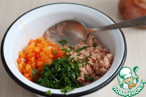 В миске смешать пассерованные овощи и пробитую в блендере тушенку.