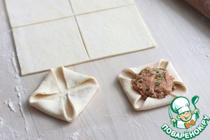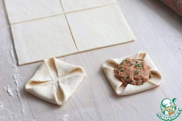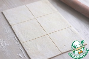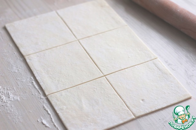 Слоеное тесто раскатать. Вырезать квадраты. Всего у вас получить из двух квадратов 12 шт слоек.