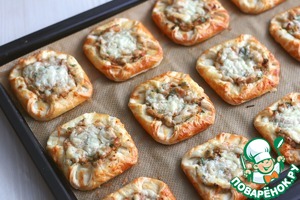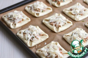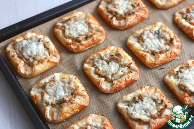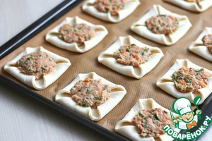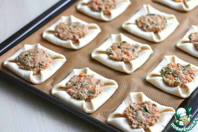 Выложить в цент приготовленный фарш (1 ст. ложку с небольшой горкой). Слойки смазать по краю взбитым яйцом.