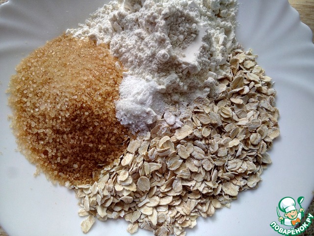 Смешать в миске овсяные хлопья, муку, сахар, соду и соль.