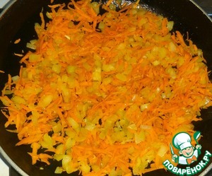 На растительном масле обжарить до прозрачности лук, добавить морковь. Жарить до мягкости моркови. -