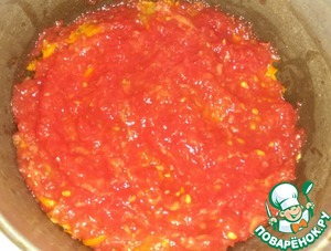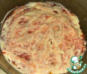 5 слой - натертые на крупной терке помидоры (без кожуры). Немного посолить, поперчить. -