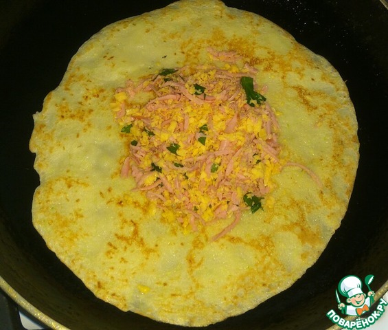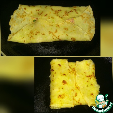 Подвернуть свободные края блинчика к середине, прикрывая начинку и формируя конвертик.