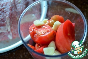 Выложить мясо в миску и залить томатно-чесночной смесью, погрузив полностью. Убрать в прохладное место на 2-12 часов.