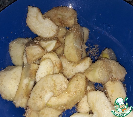 Тростниковый сахар смешайте с корицей. Яблоки помойте, удалите сердцевину и снимите шкурку. Порежьте их дольками, каждую дольку обваляйте в смеси сахара с корицей -