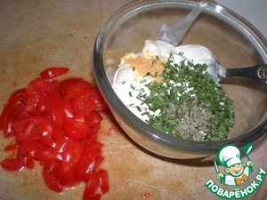 Делаем соус. В сметану насыпаем шнитт-лук (свежий или сушеный), чесночный порошок, чтобы не было так ядрено, и соль. Мелко режем помидоры и добавляем туда же. Это не помидоры со сметаной, а именно сметана с помидорами.
