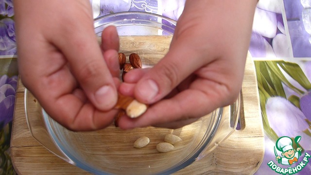 Десертной ложкой делаем лепешку из кокосовой массы, в центр-1 миндальный орешек, формируем шарик. Обваливаем в кокосовой стружке. Подаем к столу.