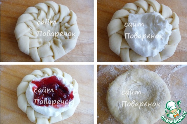 В центр выложить творог (примерно 1ч. л.), на творог - джем (примерно 1/2ч. л.).