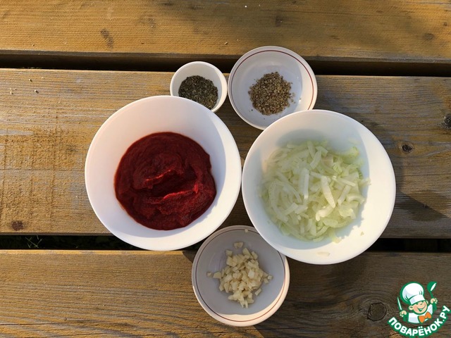 Готовим соус. Нарезаем лук и чеснок. Смешиваем томатную пасту, орегано, базилик, чеснок и лук. Обжариваем соус на сковороде, для того чтобы убрать металлический привкус. Измельчаем в блендере.