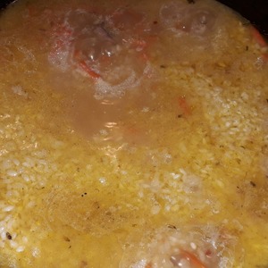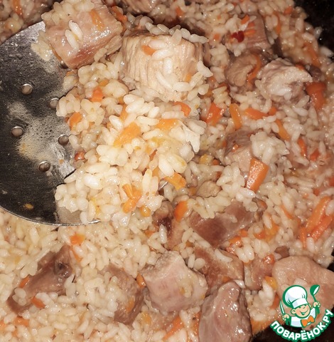 По истечению этого времени не постесняйтесь выловить кусочек мяса и надкусить его. Как правило, оно уже готово. Засыпайте рис и снова возвращайте нагрев на максимум. Мешать пока ничего не нужно. Нужно дождаться, чтобы вода с поверхности выкипела, это не долго. Можно как бы "проткнуть" массу риса до дна в нескольких местах (обратной стороной шумовки, например) для того, чтобы жидкость кипела не только по краям, а и посередине блюда.