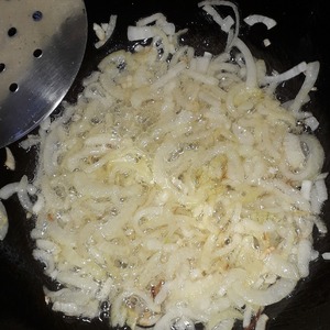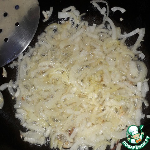 Разогрейте масло в казане на огне выше среднего. Порежьте лук полукольцами не слишком тонко и начните обжарку лука, помешивая, до соломенного цвета