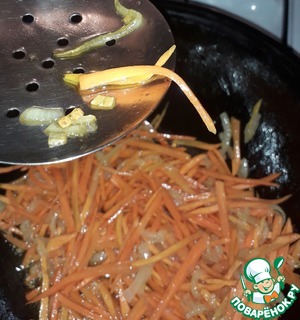 Когда лук приятно зазолотится, а звук его "шкворчания" станет как-бы суше, введите морковь. Помешивайте, обжаривайте до состояния эластичности моркови