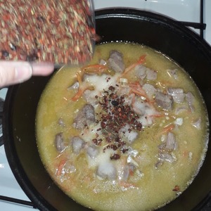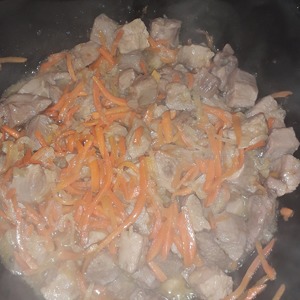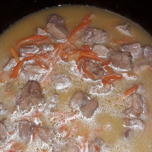 Когда цвет мяса вам понравится поджаристыми бочкАми, налейте в казан воды по уровню содержимого, дайте закипеть