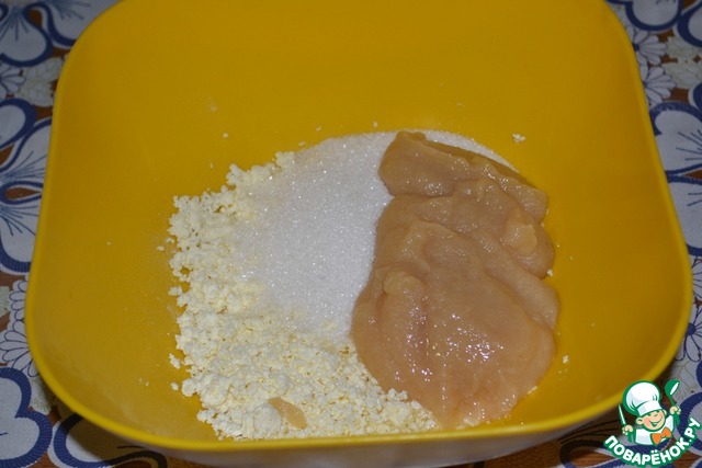 И так, в глубокую чашу положите творог, щепотку соли, сахар, ванильный сахар, масло растительное и яблочное пюре.
