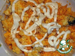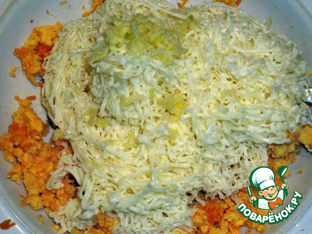Плавленый сыр натереть на мелкой терке, добавить чеснок.