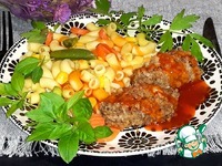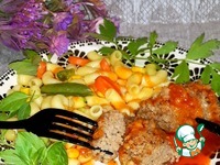 Верх котлет немного зарумянился. Подавала их с отварными макаронами и овощами - горох, морковь и брокколи. |
