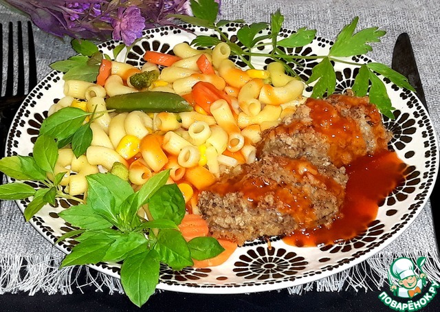 Заправила соусом сладкий "Чили". Украсила зеленью с балкона. Котлеты всем домашним очень понравились. Сочные и вкусные. |